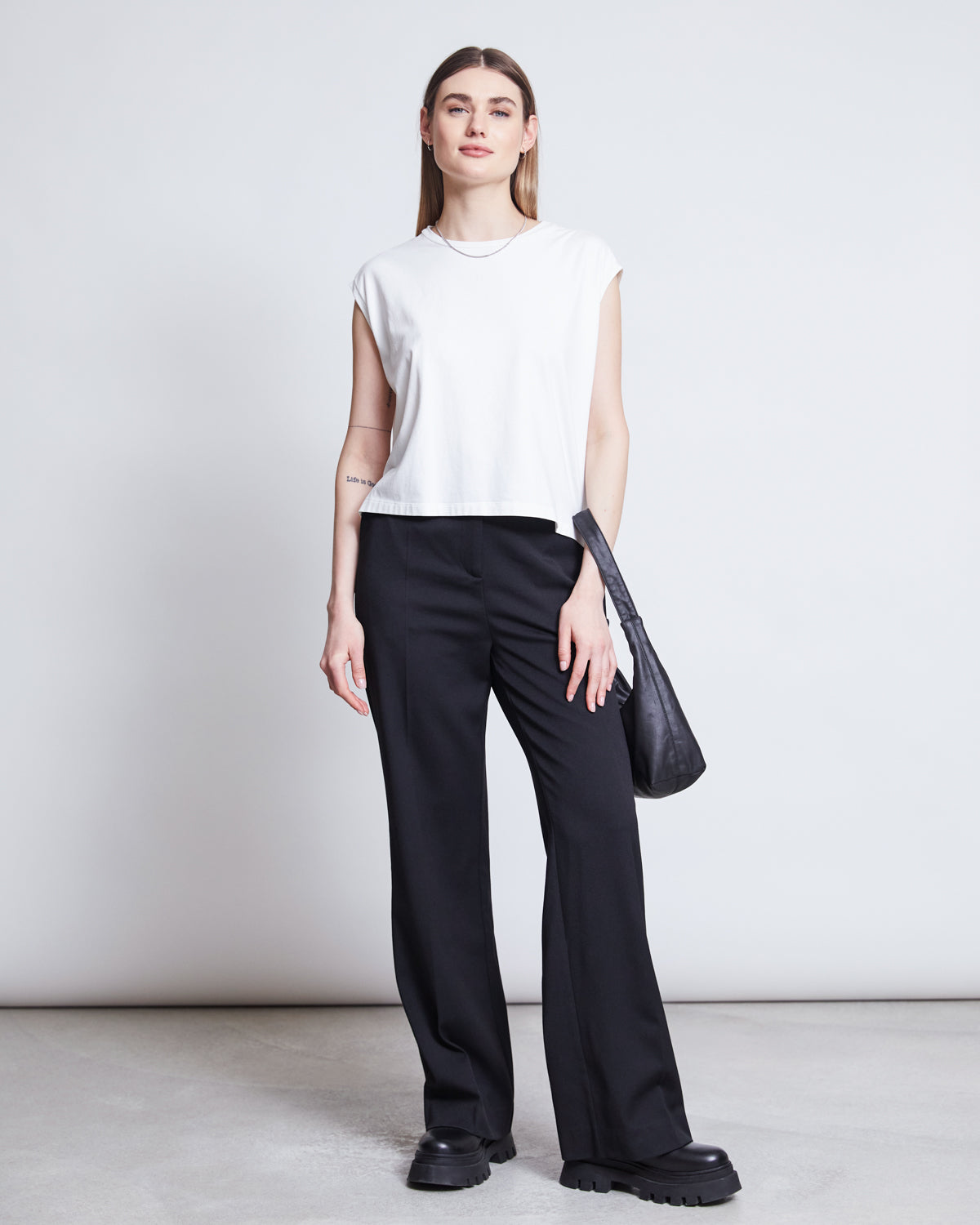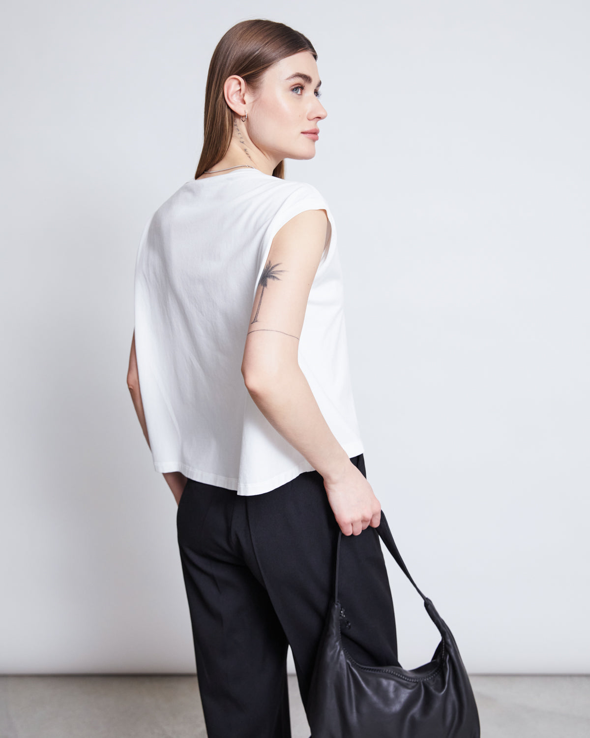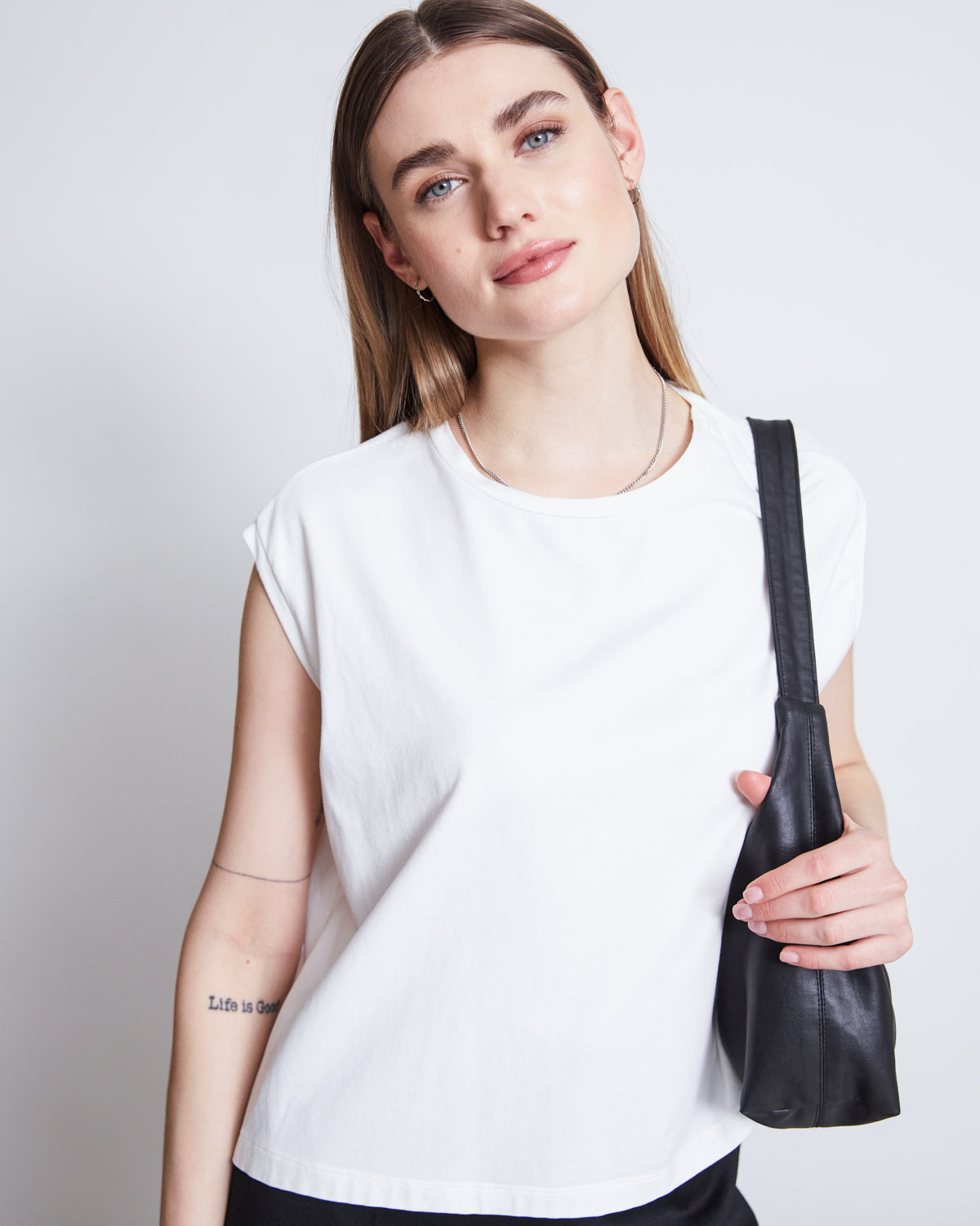Everybody loves itWe already love our organic cotton T-shirt OVAR, and we know you will love it too! OVAR is relaxed, cropped, and boxy, with a round neckline and sleeves that slightly cover your shoulders.OVAR is made from our signature super-soft, slightly elastic organic cotton jersey, which our supplier calls ‘Angel Skin.’ You’ll understand why as soon as you feel it. By the way, OVAR in white is GOTS certified. Sounds amazing, right? In case you’re wondering: our t-shirts OVAR WHITE SOFT GOTS and OVAR WHITE are the same cut and same comfort, only the material differs. The main components are cotton, while OVAR WHITE SOFT GOTS is certified with a small amount of elastane and a very soft feel while OVAR WHITE is a classic comfy cotton t-shirt.